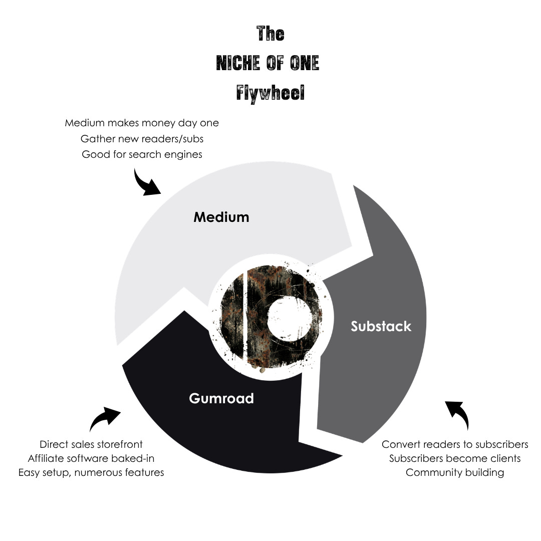 A newsletter essay becomes a Medium article becomes the seed idea for a Gumroad product. A Gumroad product generates buyer questions that become newsletter content that gets reworked for Medium.