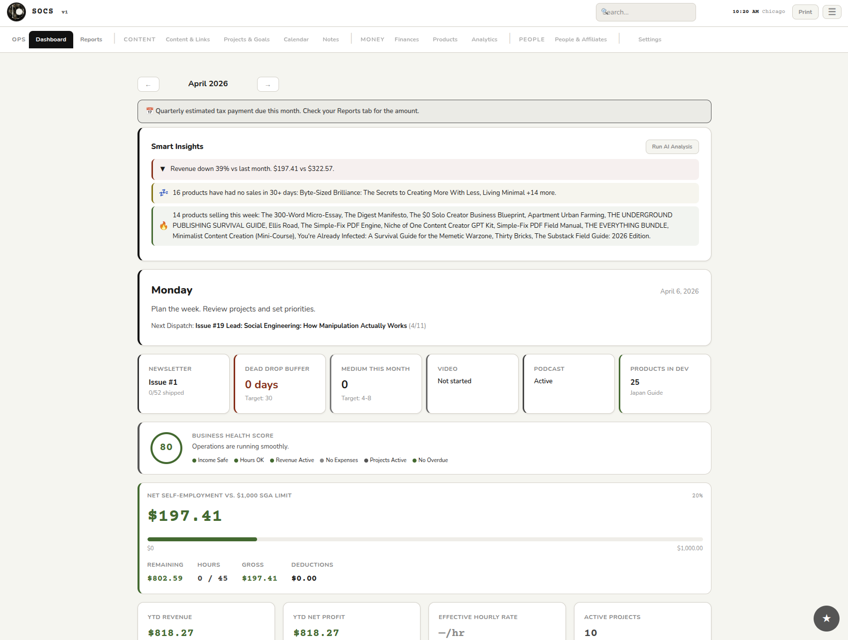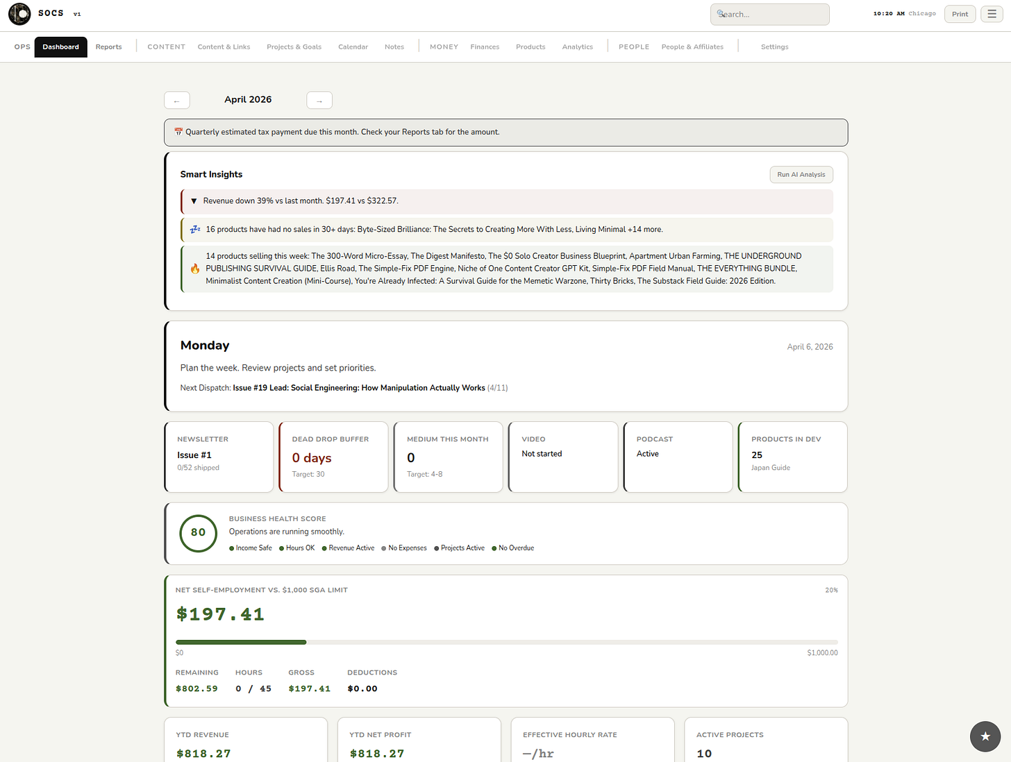 It started as a personal operations dashboard because I was drowning in the usual solo operator mess. Content calendar in one place, product pipeline in another, revenue tracking in a third, Dead Drop scheduling in a fourth, and none of them talking to each other.