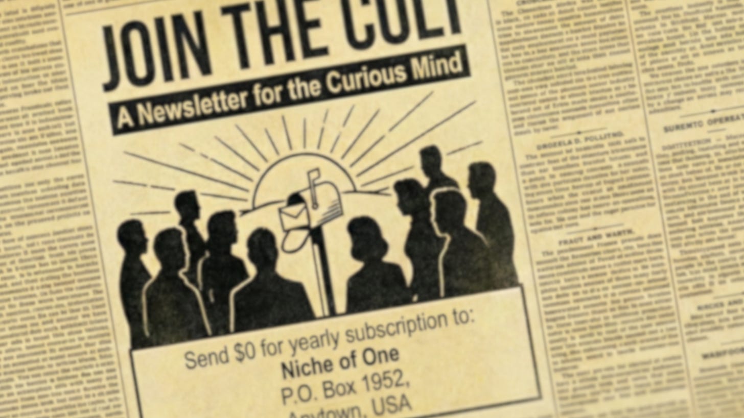 Subscribe NOW and get FREE Strangeness!Don't HESITATE! Limitless supplies of free weird.Dec 22, 2025331ShareI decided to write a theme song for Niche of One. You’re welcome.Join the Cult.0:00-1:57Audio playback is not supported on your browser. Please upgrade.JOIN THE CULTPrevious